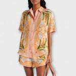 Objímte retro eleganciu s naším vintage botanickým kaleidoskopovým tlačovým dvojdielom. Tento ohromujúci súbor pozostáva z košele bez goliera s gombíkmi, ktorá je kombinovaná s plynulou, vysoko pásovou sukňou, ktorá zobrazuje živé kvetinové vzory a fascinujúcu symetriu, vyžarujúcu umelecké čaro.