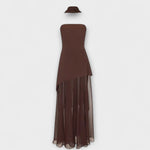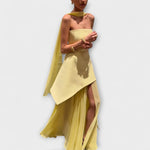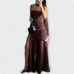 Tieto ohromujúce bezramienkové šaty majú štruktúrovaný vrch a splývavú chiffon vrstvu, ideálne na slávnostné príležitosti a zvláštne momenty. Dlhý, priehľadný materiál zabezpečuje pôvabný pohyb, zatiaľ čo bočný rozparok posilňuje jeho dynamický vzhľad.