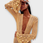 Vytvorte svoj štýl s našimi ohromujúcimi zlatými pletenými šatami, ktoré sú navrhnuté tak, aby ste žiarili pri každej príležitosti. S hlbokým V-výstrihom a rozšírenými rukávmi kombinujú tieto šaty eleganciu s nádychom zábavy vďaka svojim hravým detailom z flitrov.