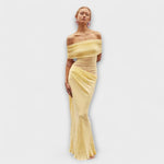 Zmyselný strih: odhalené ramená a jemné riasenie pôsobia mimoriadne elegantne.