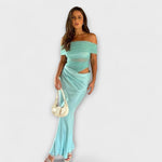 Tieto výnimočné večerné šaty sú stelesnením luxusu a ženskosti. Ich priliehavý strih dokonale kopíruje línie tela, zatiaľ čo jemné nariasenie a odhalené ramená dodávajú modelu zmyselný a sofistikovaný vzhľad. Ideálne na galavečery, svadby či špeciálne príležitosti, kde chcete pôsobiť neprehliadnuteľne. Každý detail je navrhnutý tak, aby zvýraznil eleganciu, sebaistotu a jedinečný štýl nositeľky.