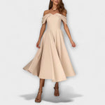 Osviežte svoj šatník našimi ohromujúcimi šatami s odhalenými ramenami, ktoré lichotia každej postave. Zakryté srdiečkové výstrihy a sochárske rukávy s odhalenými ramenami dodávajú nádych ženskosti, zatiaľ čo priliehavý vrch a rozšírený midi lem vytvárajú klasickú siluetu pieskových hodín.